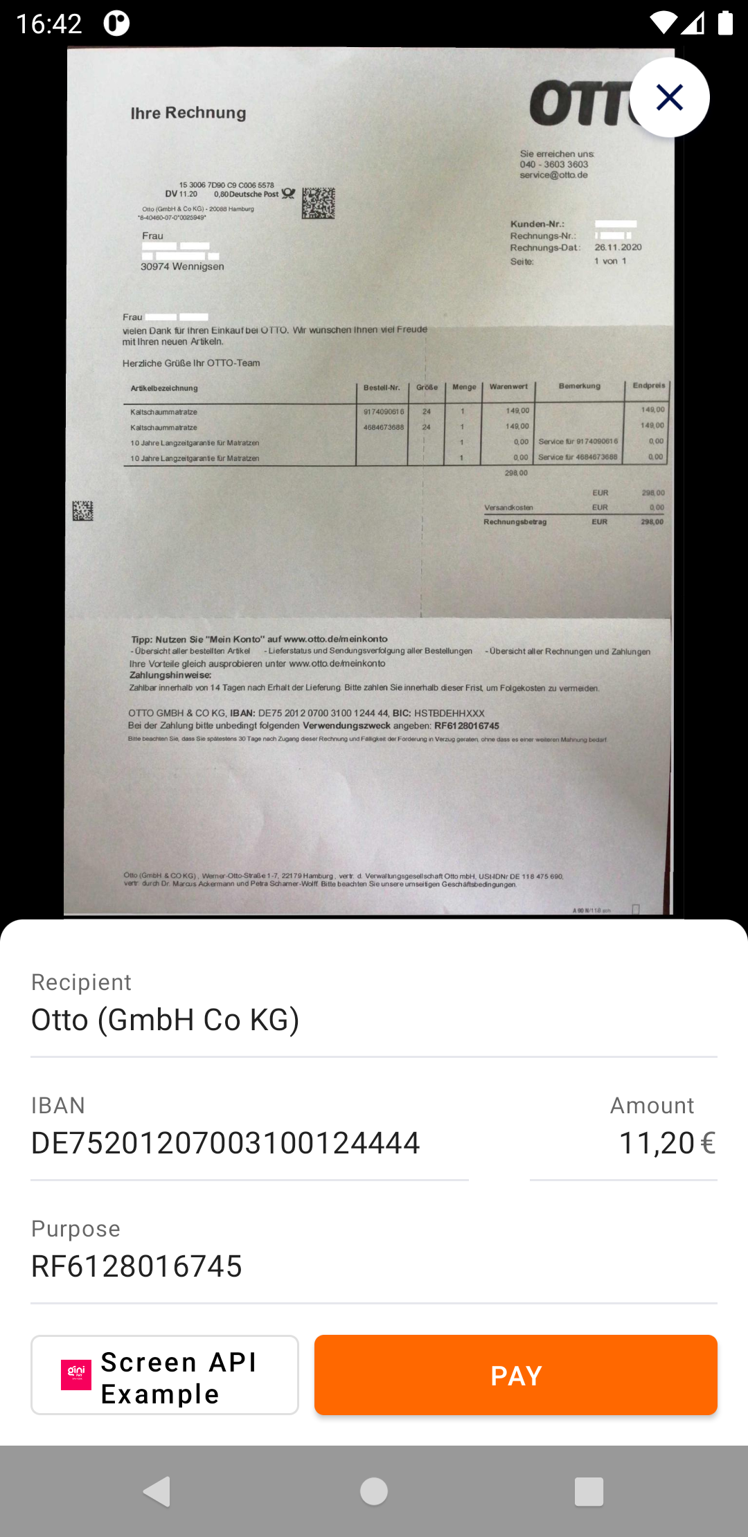 Check that the extractions and the document preview are shown and then press the Pay button: